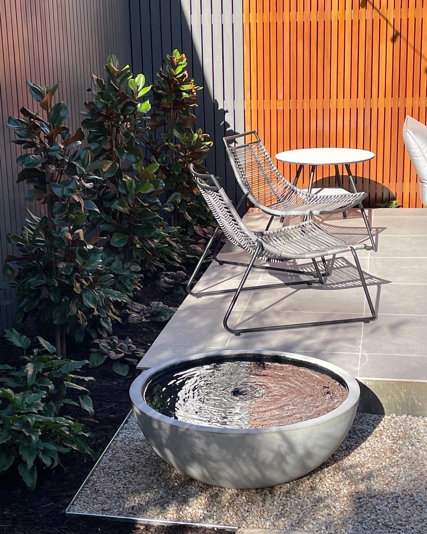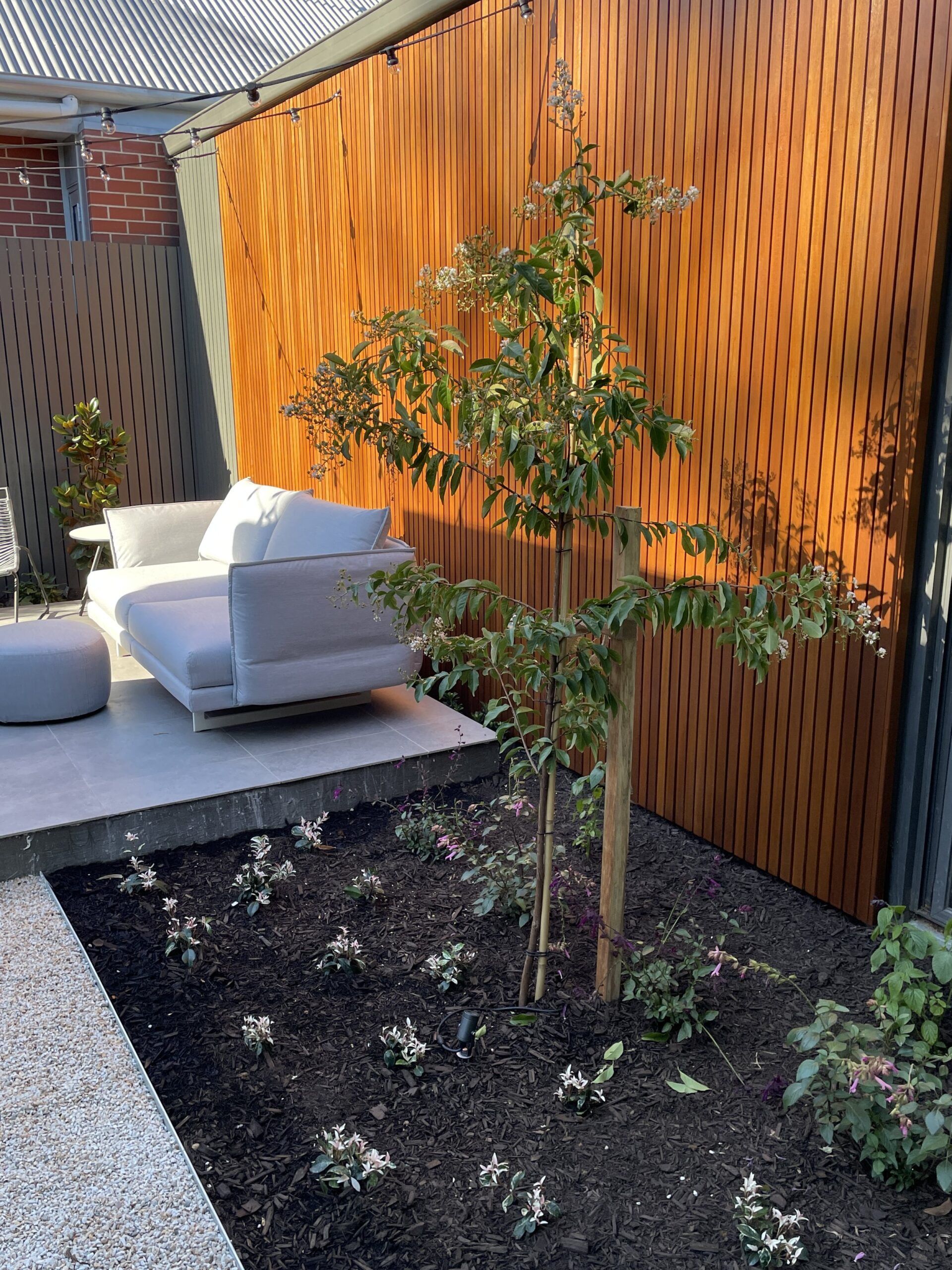 Hiding neighbouring homes was essential to give the garden an embraced feel. We did this using Magnolia trees, Murraya hedging and pleached bamboo.