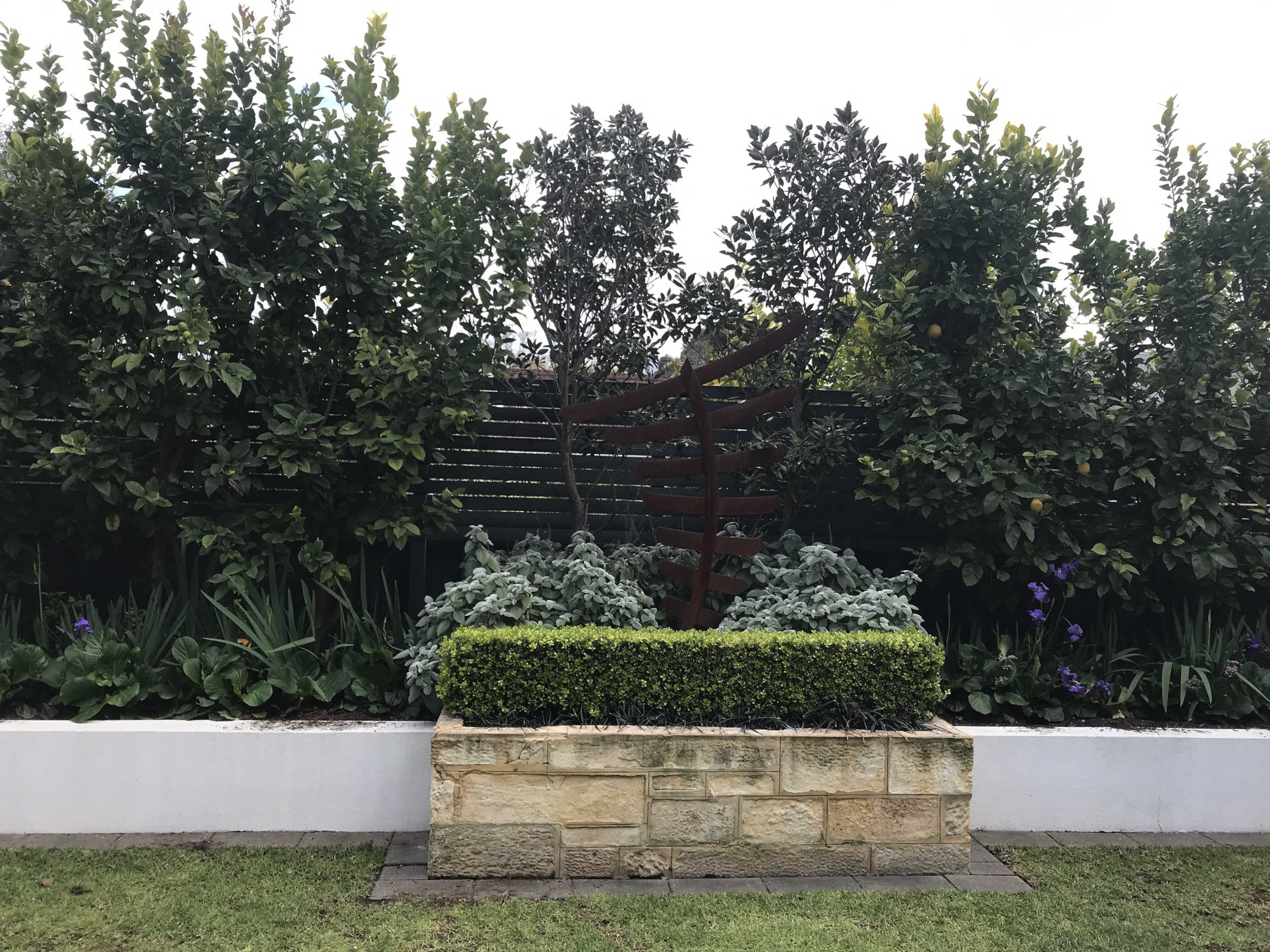 The back garden was designed for a family with four children so planting was put to the extremities. A gorgeous Pierre de Ronsard rose hides the large shed in the corner of the garden. Garden Art placed for maximum impact upon arrival and interest in the garden.