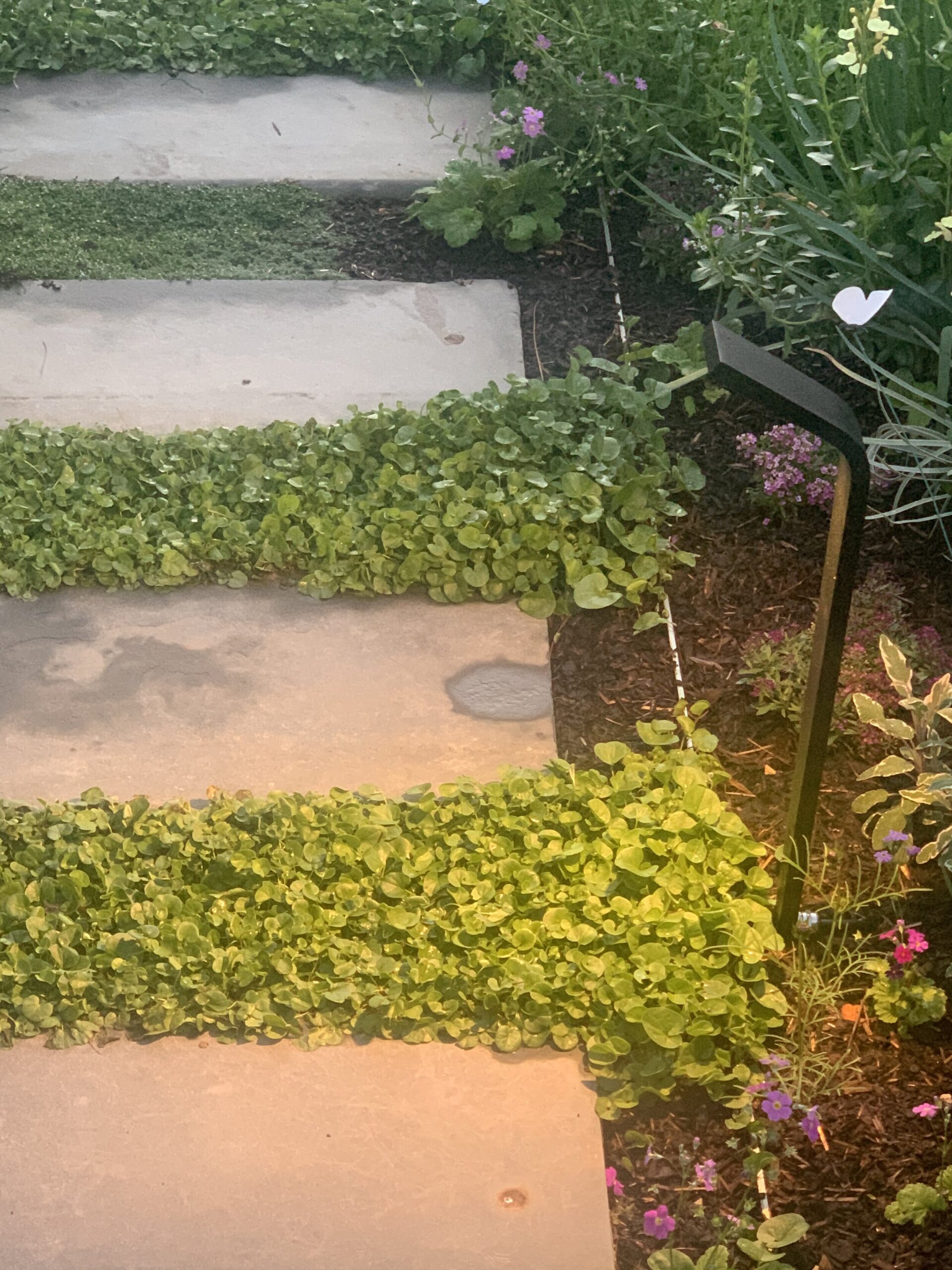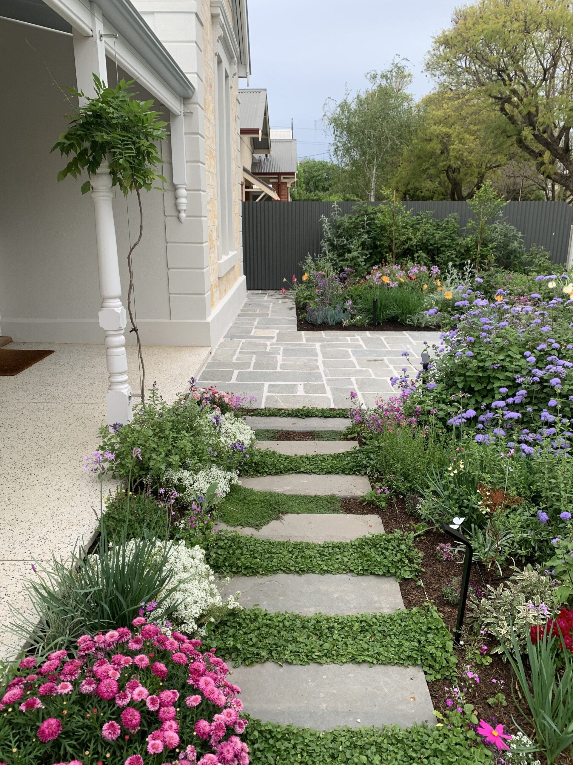 We were given free rein to select colours and finishes for the colour palette and hardscaping. However, one constraint was that Jill wanted to retain the terrazzo on the front verandah. Whilst on a site visit we found the original slate from the verandah in the back garden holding up the raised vegetable garden. We re-purposed this and used them as steppers in the front garden.