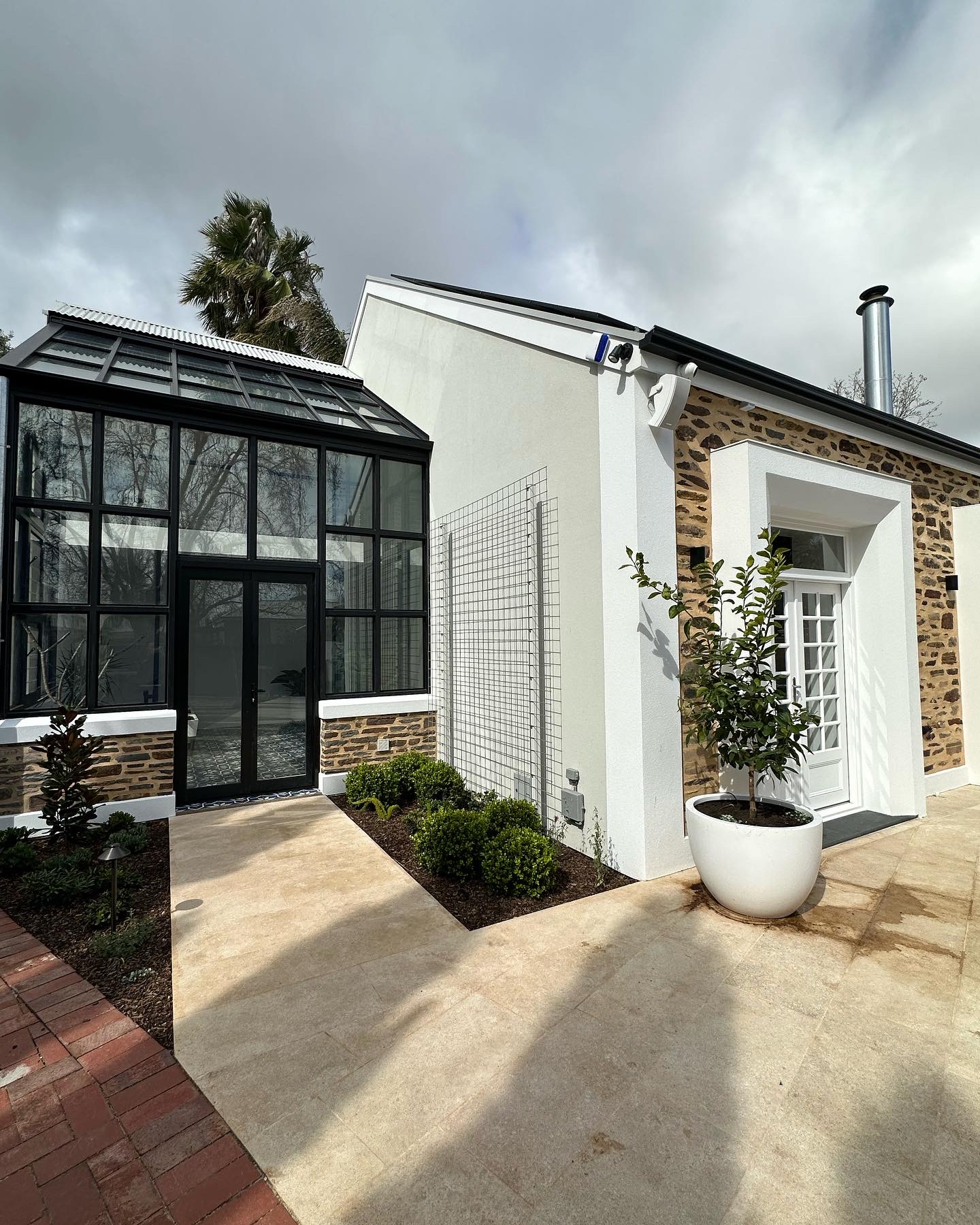 Outside each French door, oversized pots with citrus trees create vertical interest and frame the travertine flagstones, extending the garden’s charm onto the terrace. A small lawn area offers a space for the family’s young children to play, spilling out naturally from the pool area.