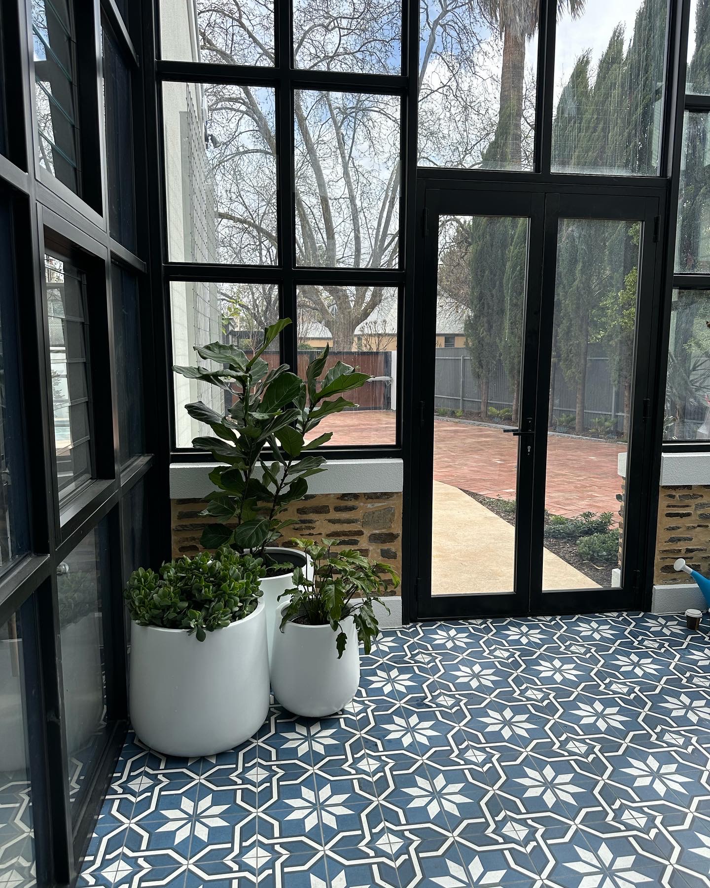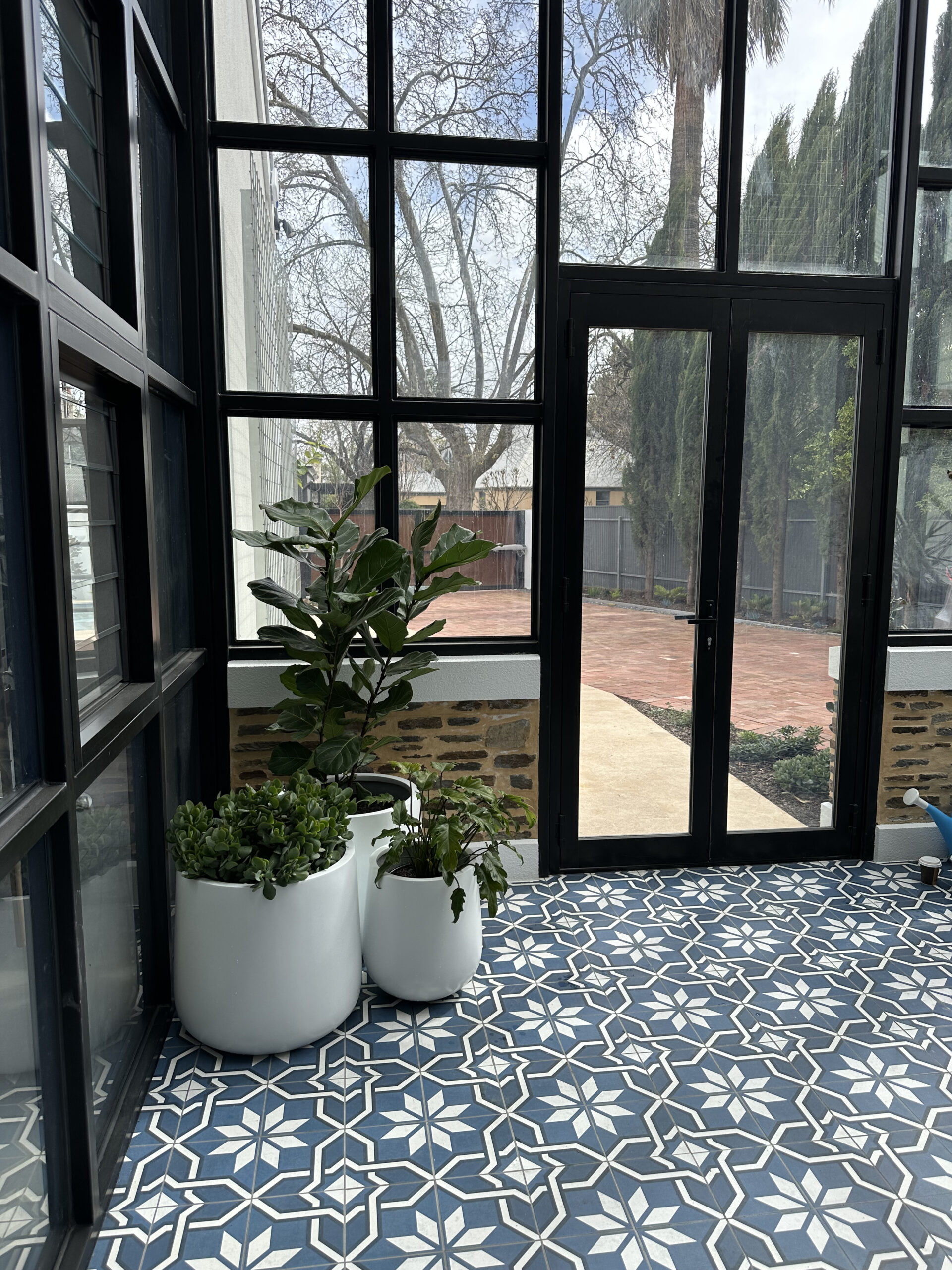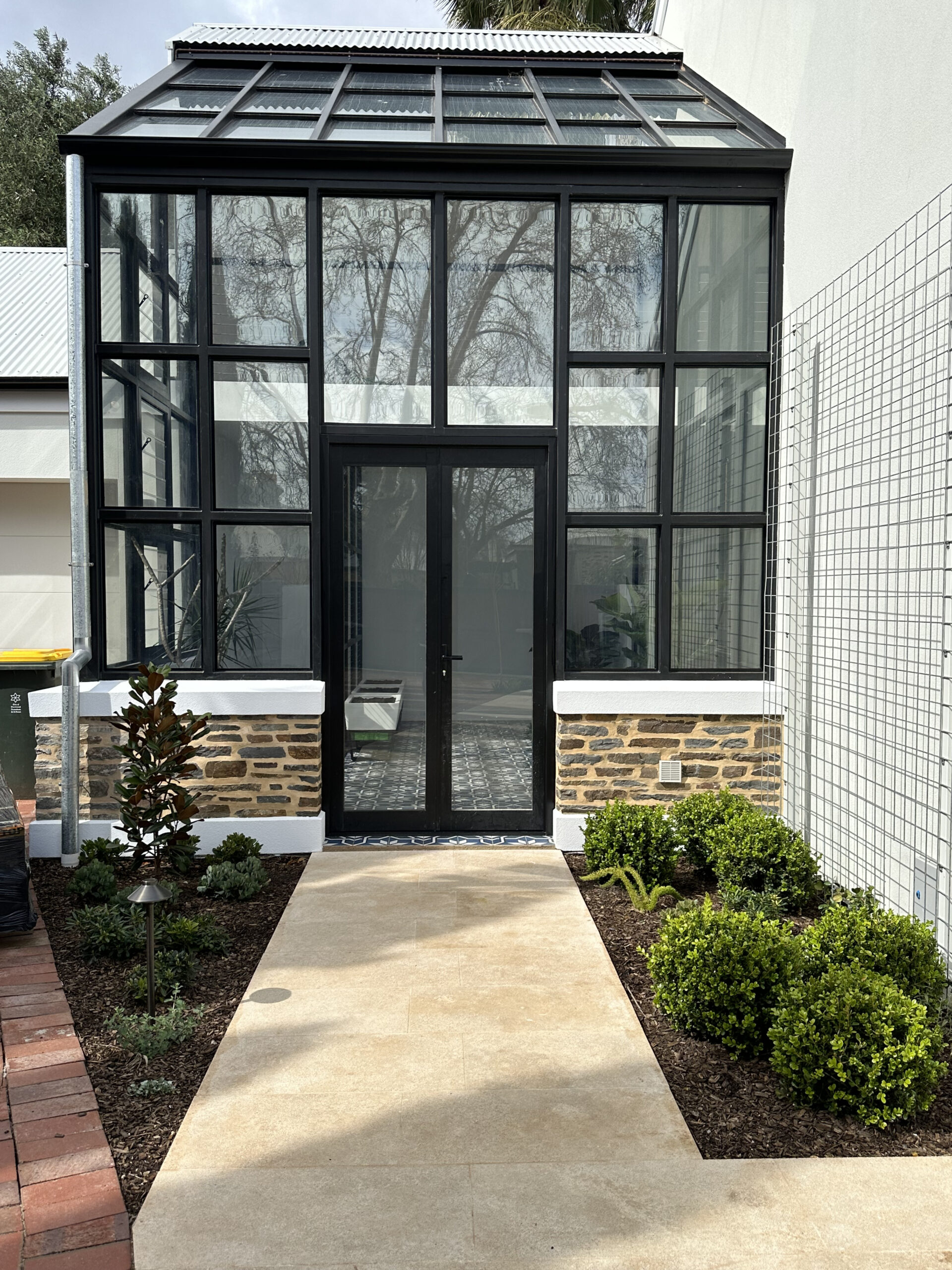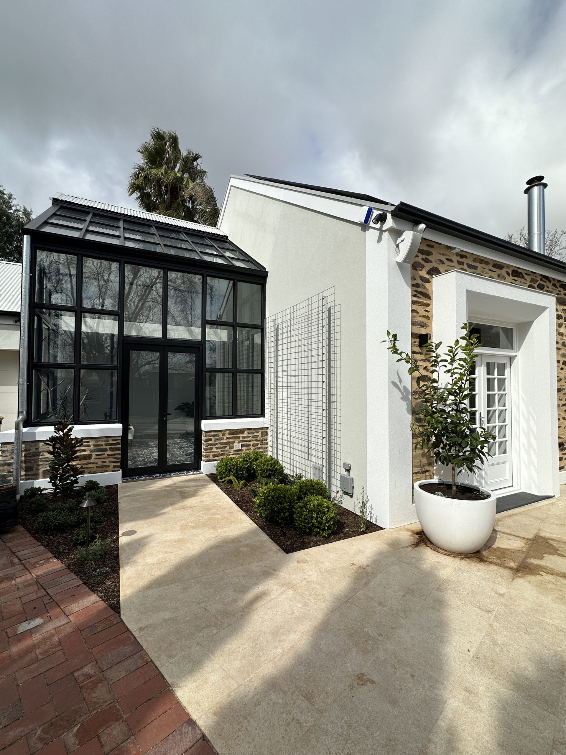 Family and friends are greeted by a new side gate that opens into a vibrant poolside garden, creating a welcoming entry point. Leading to the home’s double-height glass atrium, the path transitions into a lush garden space with clusters of potted indoor plants. These selections thrive across seasons, bridging the indoor-outdoor connection while cooling and softening the modern architectural lines.