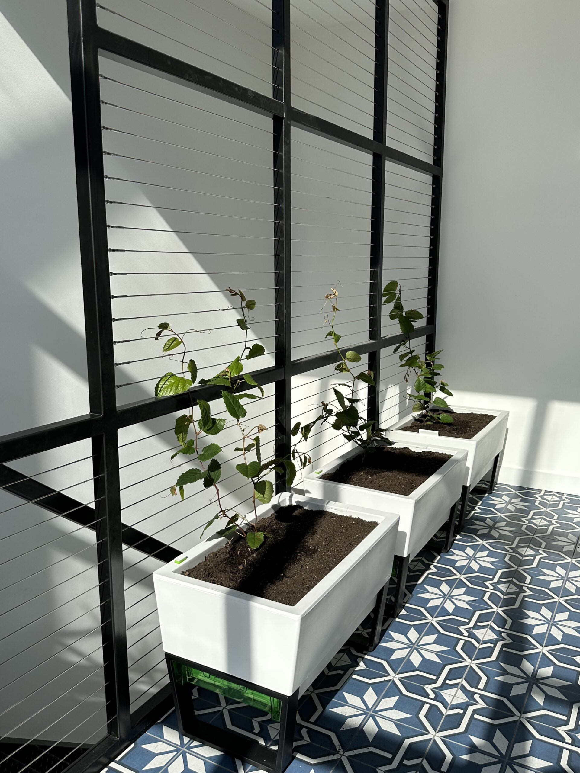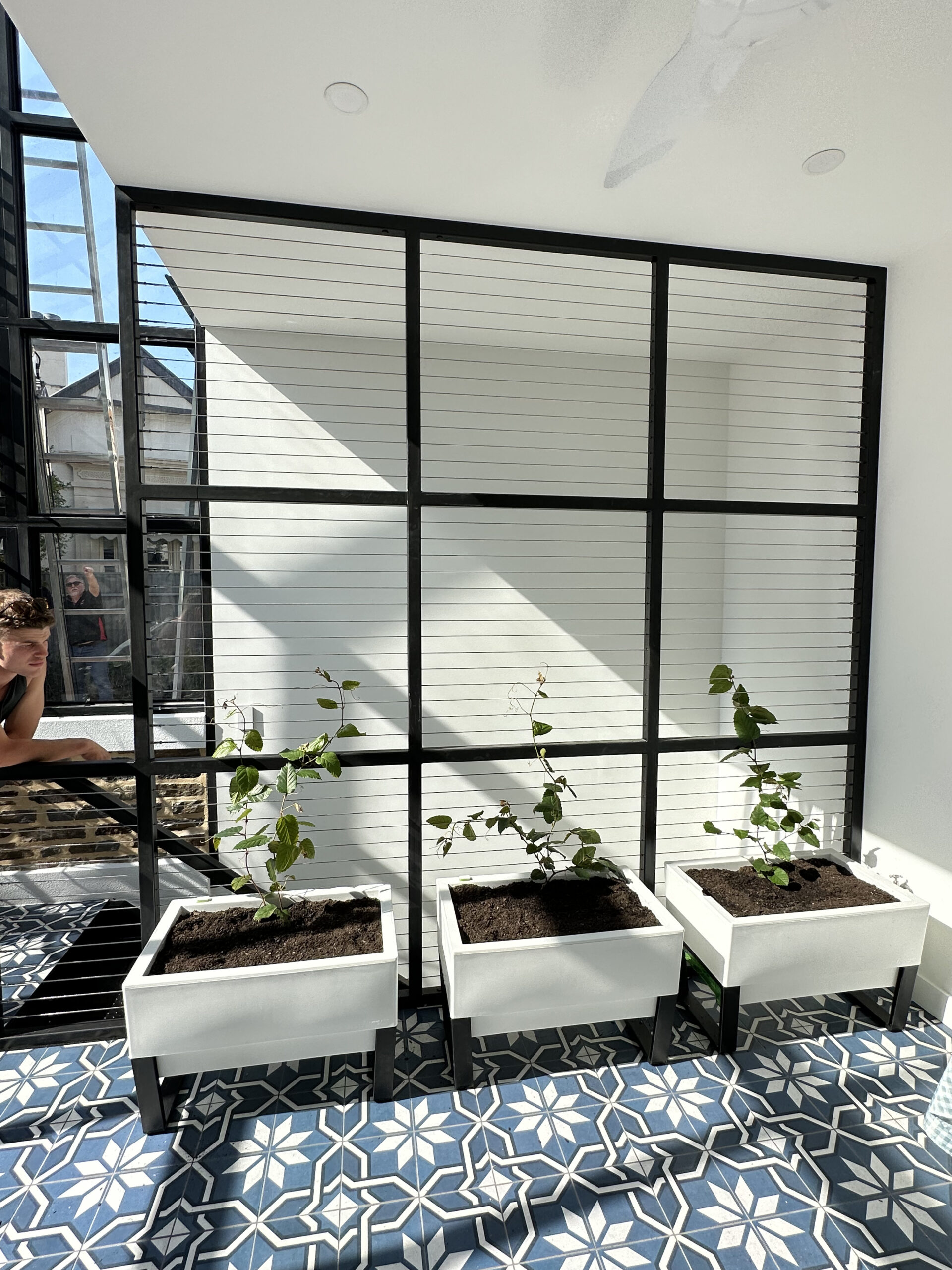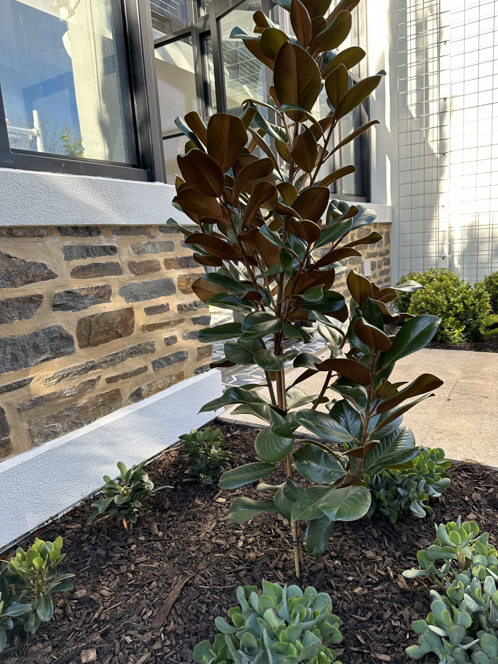 To enhance the formal elegance near the entry, we installed a green wall of fragrant Star Jasmine paired with Japanese box spheres and perennial underplanting’s. The result is a structured yet inviting atmosphere that perfectly complements the home’s design.